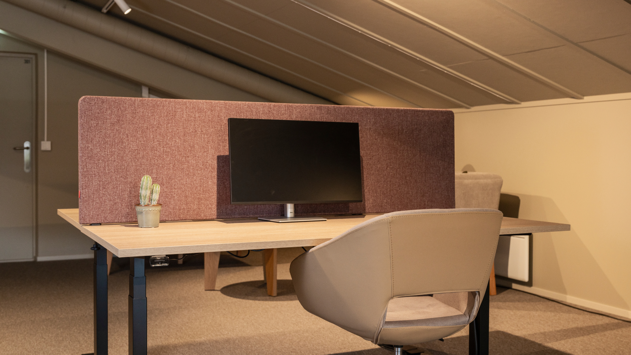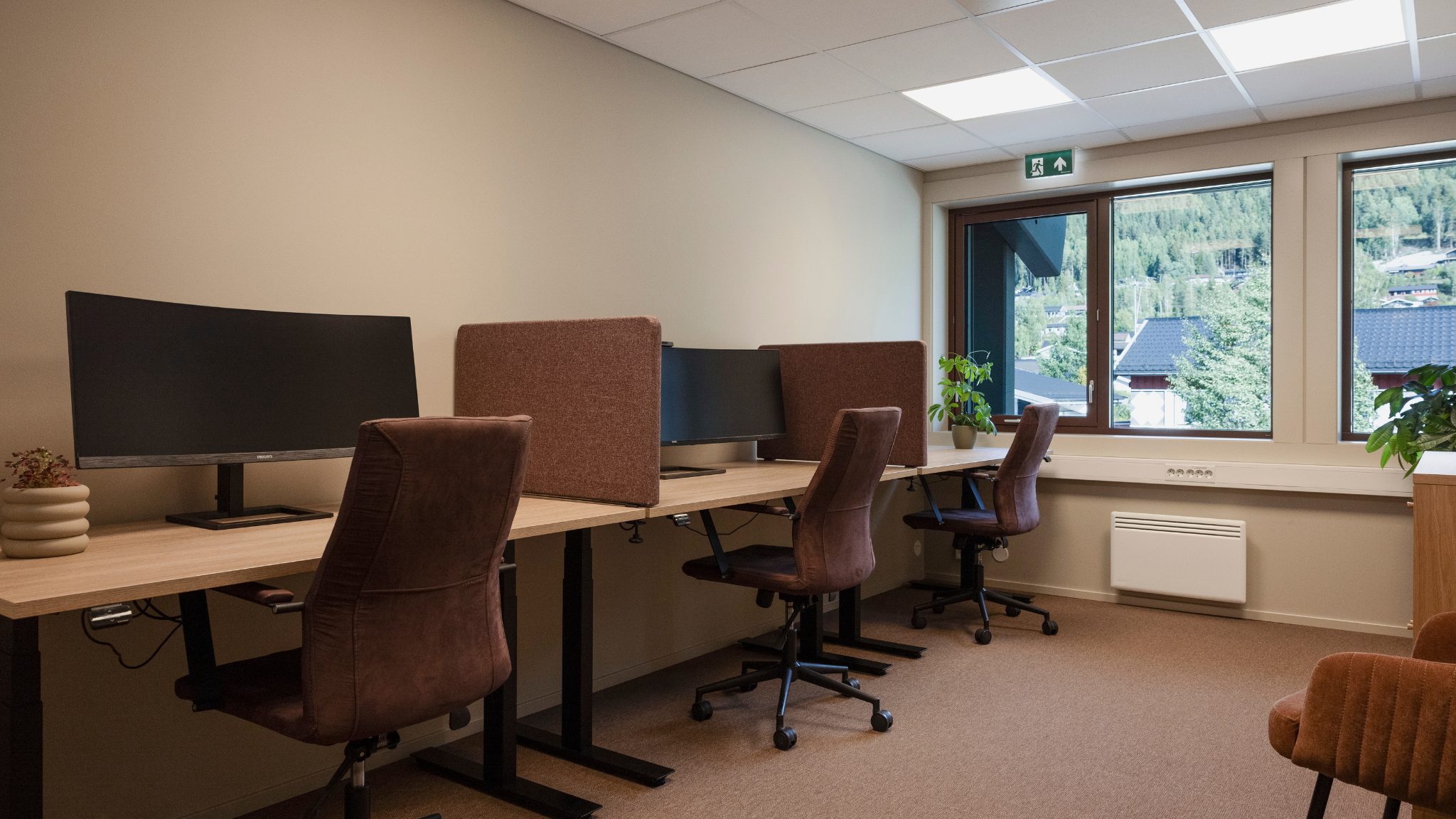 Våre største kontorer ligger i byggets 2. etg. vendt mot Sentrumsvegen. Rommene måler 17,1 m2 og er møblert med 2 hev/senk pulter og 2 kontorstoler.