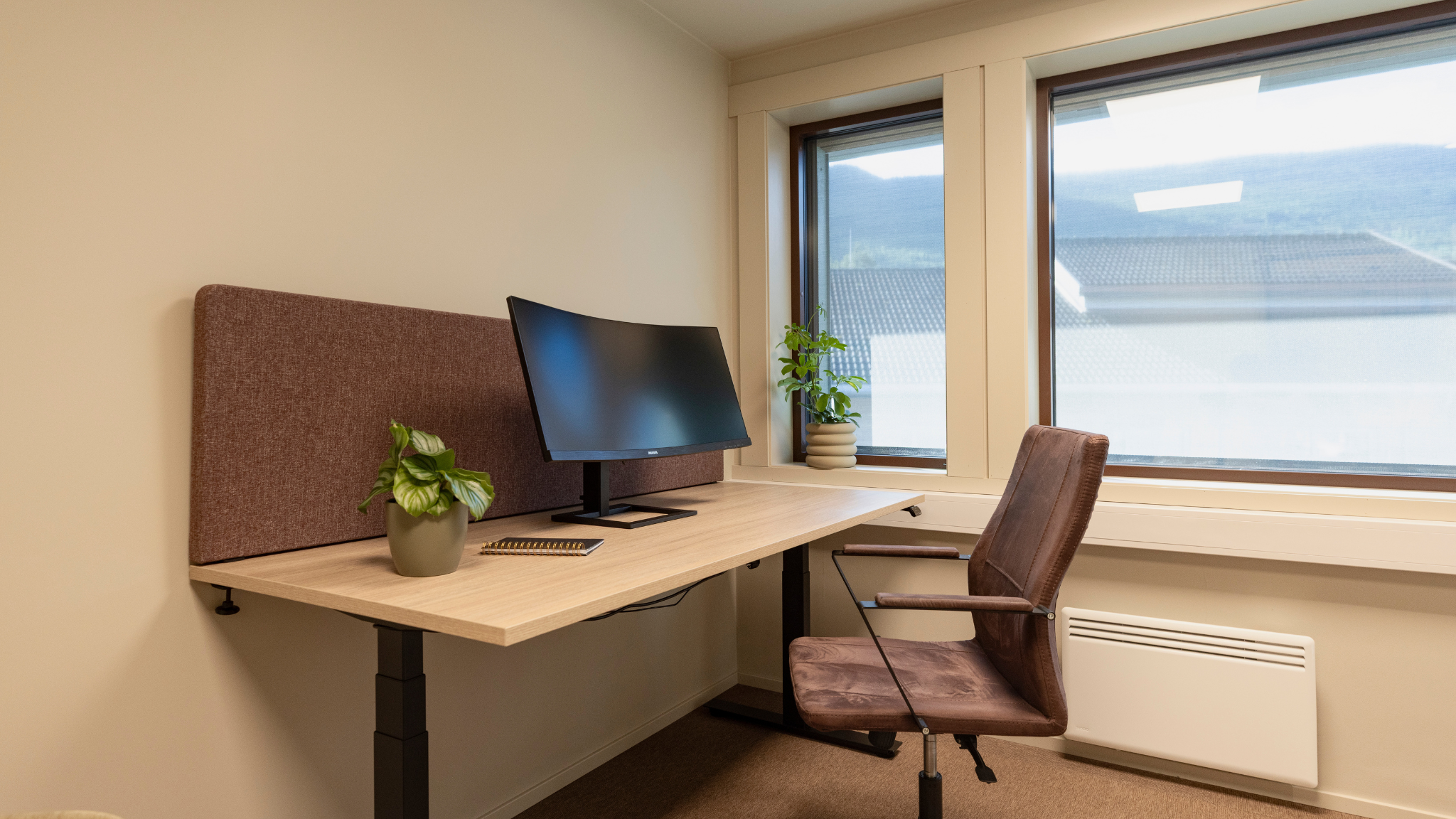 Våre medium kontorer ligger i byggets 2.etg. vendt mot politihuset. Rommene måler 10,3 m2 og er ferdig møblert med hev/senk pult og kontorstol.