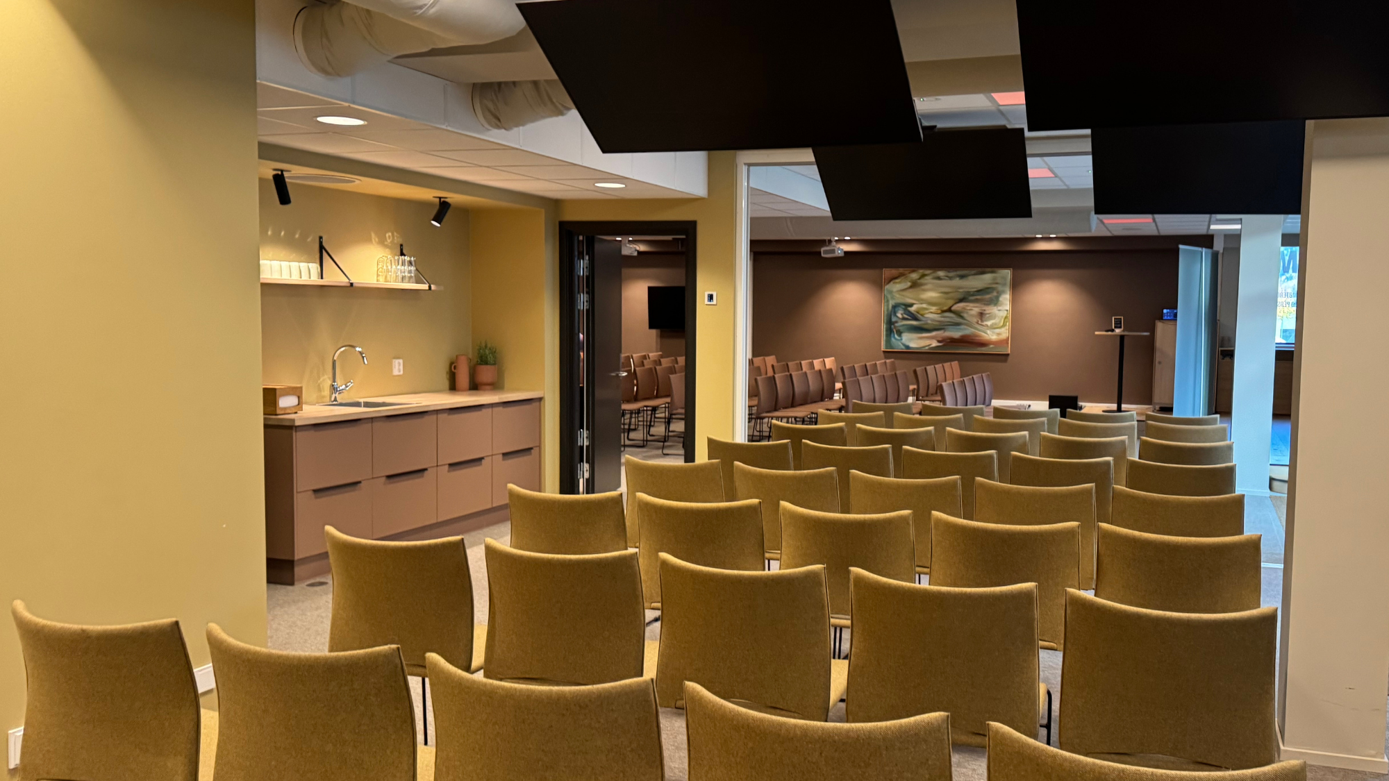 Horisont 1 er vårt største møterom som gir mulighet til å velge det oppsettet som passer ditt arrangement; gruppebord, klasserom eller kino. Rommet er utstyrt med lerret, prosjektor og kameraer i taket i begge ender, høytalere / mikrofoner i taket, samt håndholdt mikrofon og mygger. Den integrerte teams-løsningen gjør rommet spesielt godt egnet for webinarer og hybride møter.